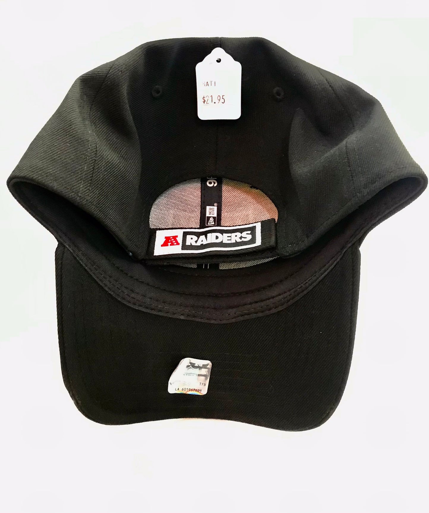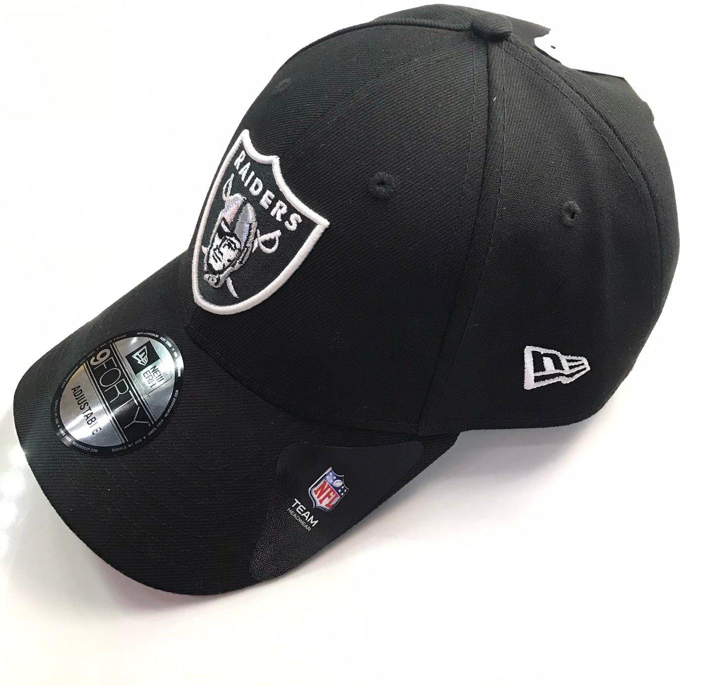 This Black Colored Hat Is a New Era 9Forty Las Vegas Raiders Adjustable Cap, Embroidered Raiders Logo On The Front, New Era Flag On The Left Side And a Team Patch On The Rear Strap.