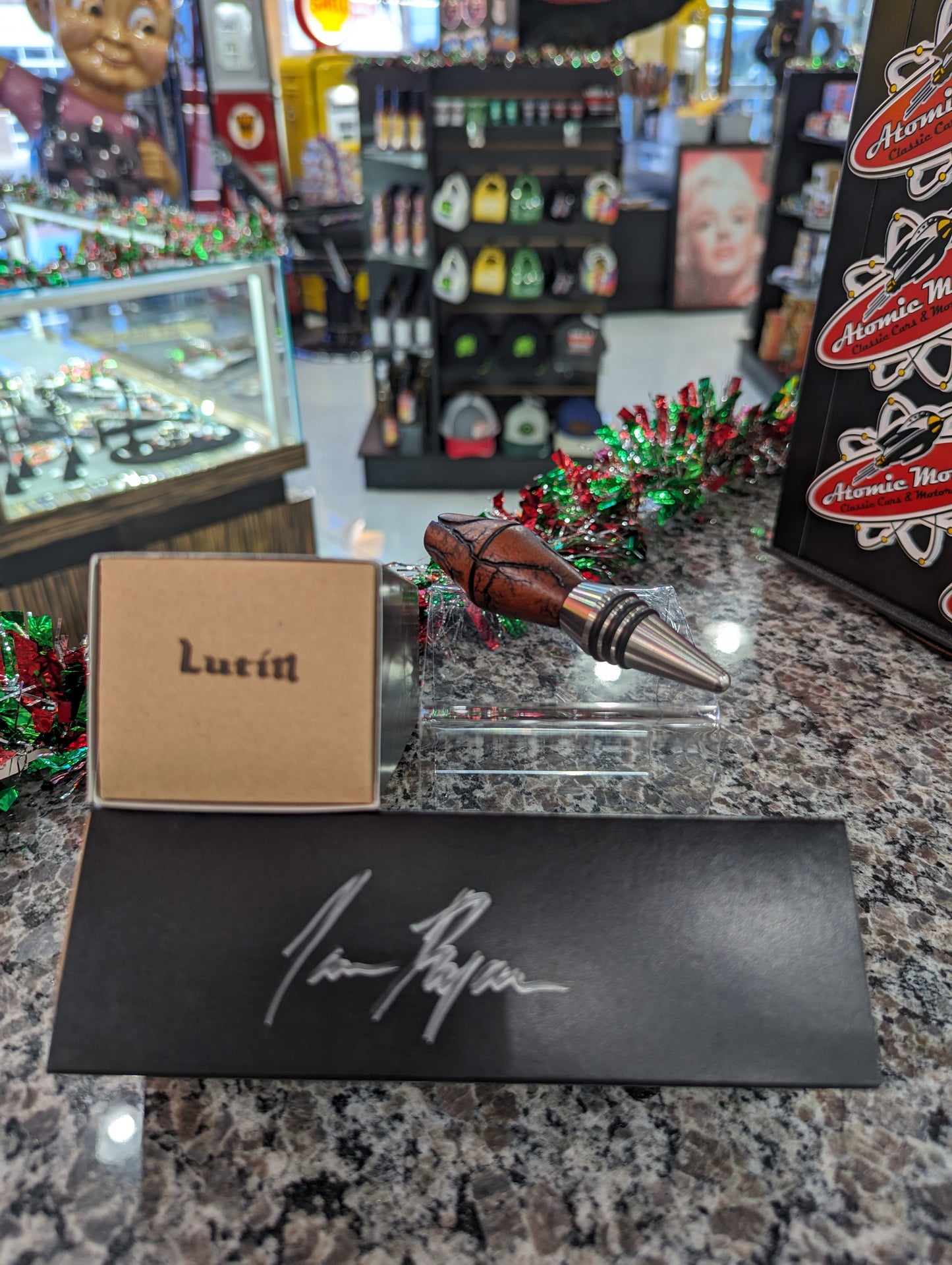 Custom, One-of-A-Kind, Curly African Mahogany Wood Bottle Stopper That is Hand Crafted By Ian Of Lutin BrushWorks. Using The Process of Fractal Burning It Creates A Pattern That is Formed on Each Piece That Will Never Match Another. Comes Gift Boxed.