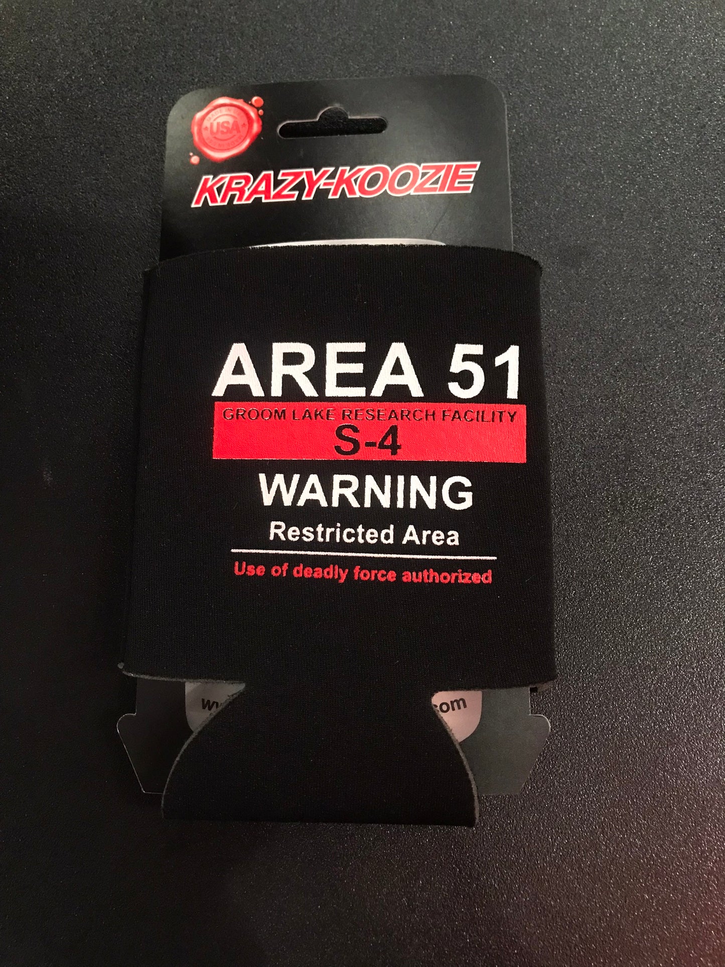 This Is a Red And Black Coozie With a Text Mention: Area 51, Groom Lake Research Facility, S-4, WARNING, Restricted Area, Use Of Deadly Force Authorized
