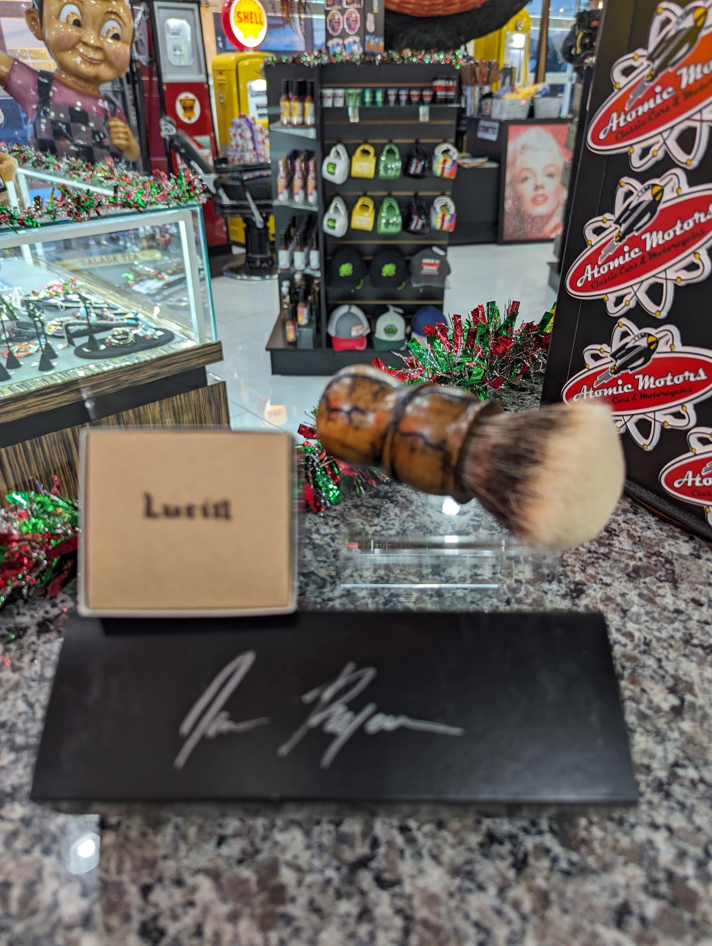 Custom, One-of-A-Kind, Myrtle Wood Shaving Brush That is Hand Crafted By Ian Of Lutin BrushWorks. Using The Process of Fractal Burning It Creates A Pattern That is Formed on Each Piece That Will Never Match Another. Made of Badger Hair. Comes Gift Boxed.